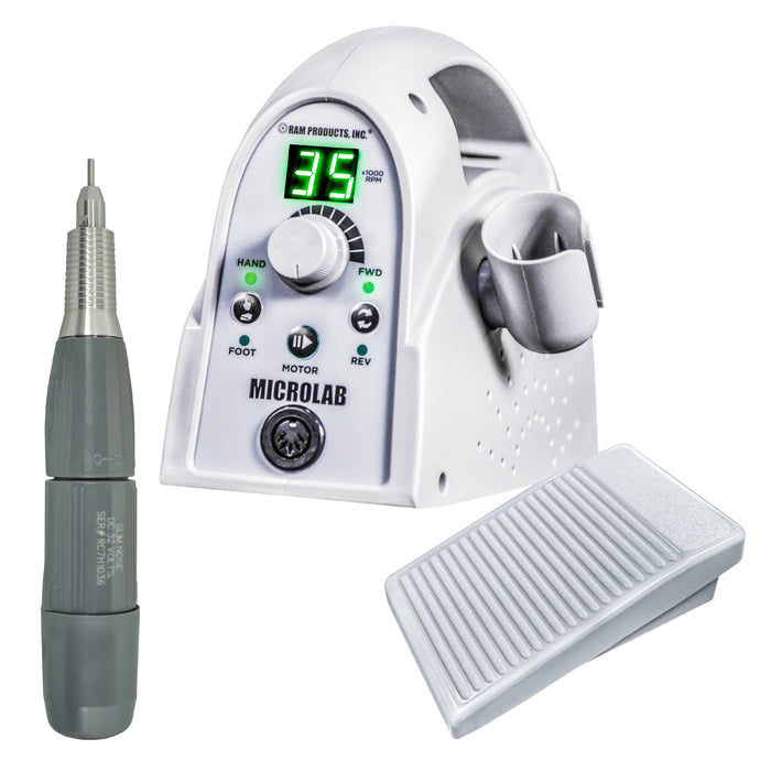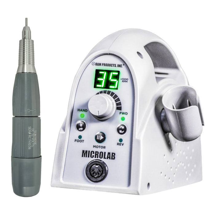 Microlab now features upgraded electronics with precise digital speed control, soft start and stop technology, audible sounds and convenient standby mode. It is full of features unique to Ram at a fraction of the price of its competitors. Superior safety overload and protection along with a convenient right-side handpiece holder and built-in handle to carry.