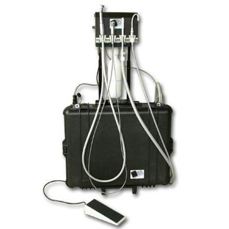 The lightweight, one-piece design includes a dual-hose operation (saliva ejector and HVE), a large waste container with automatic overflow shut-off, an internal water supply, an air-water syringe, and an impact-resistant case. These are just some of the features integrated into this exceptional self-contained unit.
