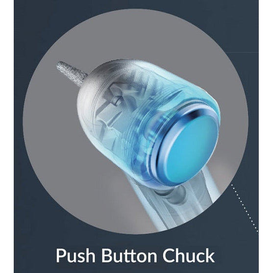 - Push Button Chuck - Elaborately and precisely designed mechanism that allows easy insertion and removal of burs with a simple "one press" of button. The tension on the bur increases as it rotates.