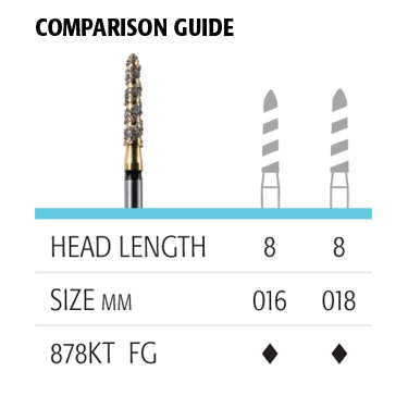 The design of the 878KT Typhoon Diamonds includes a recessed channel that is not diamond coated to allow maximum flow of irrigation, thus allowing debris to be more efficiently carried away from the tooth surface. With less overall area of diamond coating, frictional drag is decreased without a loss in cutting efficiency.