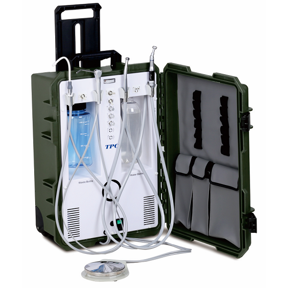 The PC2930 is a portable dental unit for dental professionals. It possesses the same capabilities that are used in modern dental offices. Some of its standard components include 2 handpiece positions, 3-way syringe, and suction. The unit also contains a water bottle for clean water and a waste bottle system for collecting saliva that is removed with the low suction. It contains a built in oil less air compressor and tank to allow the user to use the unit without delay.