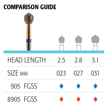 Maverick 905 Occlusal Shaper Diamonds have consistent grit size which makes for great handling qualities. They are crafted by German technicians who have perfected the art of manufacturing diamond-cutting tools. The enhanced particle coverage at the tip makes for better longevity than the other leading diamonds in the market.