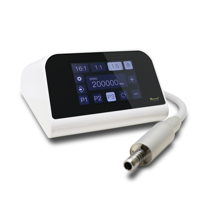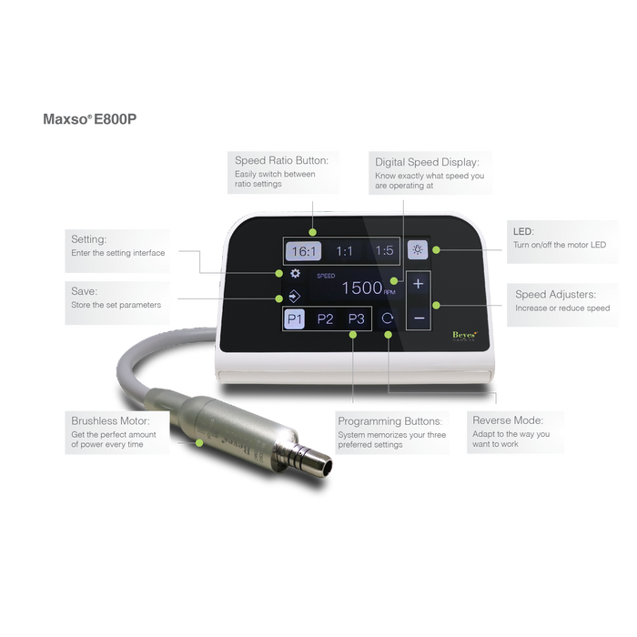 Beyes® has made upgrading to the newest electric technology easy with the Maxso® E800. Equipped with a touch screen interface and 3 programmable preset speeds, this brushless electric micromotor system is designed with ultimate user-friendliness in mind. With customizable settings, the system is the perfect solution for all high-speed and low-speed applications. Its quiet motor delivers uncompromised power – featuring advanced rotational control technology, resulting in only the smoothest and steadiest operation. Integrate the Maxso® E800 into your practice with ease and start experiencing the advantages of electric today.