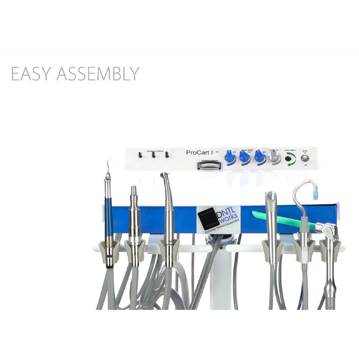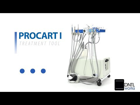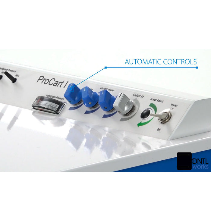 Available upgrades, that make the ProCart I even more versatile, consist of a piezo-electric scaler, fiber optics, and curing light. Standard features include a built-in, quiet air compressor, separate vacuum pump for saliva ejector and HVE, a large-capacity waste container with overflow shut-off, internal water supply, air/water syringe, and casters for smooth mobility.